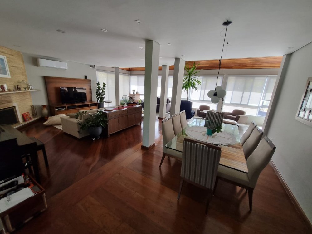 Sala integrada com lareira, possui 3 ambientes sendo um deles, sala de jantar.